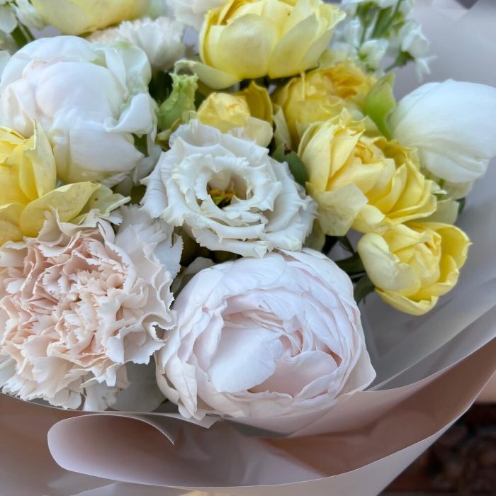 Маттиола – 3 шт.Лента атласная – 2 шт.Диантус – 3 шт.Пион белый – 3 шт.Пленка матовая – 7 шт.эустома махровая белая – 1 шт.роза кустовая пионовидная желтая – 2 шт.