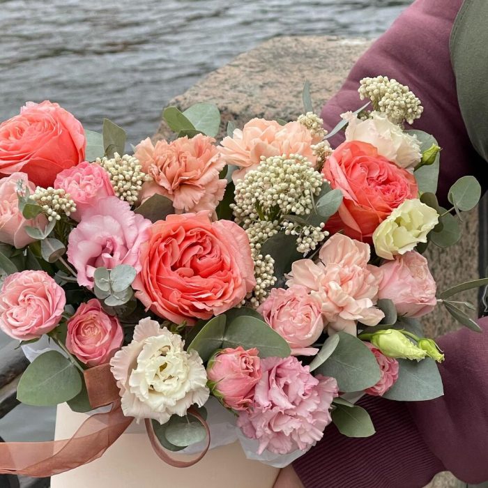 Роза пионовидная кахала – 3 шт.Роза кустовая пионовидная мадам бомбастик – 2 шт.эустома розовая махровая – 2 шт.Диантус – 3 шт.Озотамнус – 2 шт.Эвкалипт – 3 шт.Оазис флористический – 1 шт.Коробка шляпная – 1 шт.
