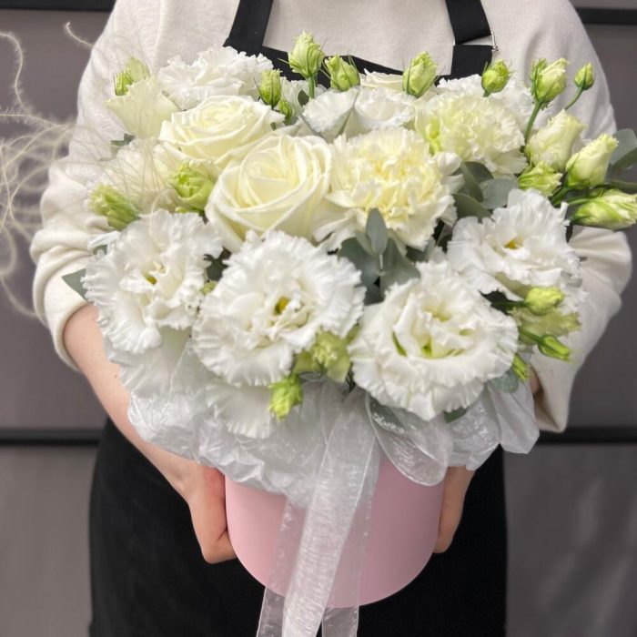 роза пионовидная плайя бланка – 3 шт.эустома махровая белая – 3 шт.Диантус – 3 шт.Эвкалипт – 2 шт.Оазис флористический – 1 шт.Коробка шляпная – 1 шт.Лента атласная – 2 шт.Тишью – 1 шт.Ковыль – 1 шт.