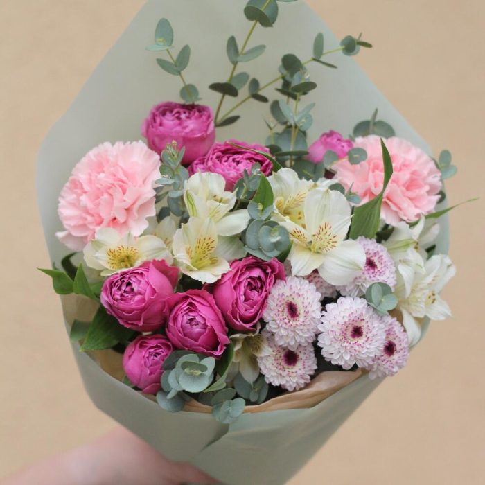 Категорий: Альстромерии, Гвоздики, Пионовидные розы, Розы, Хризантемы