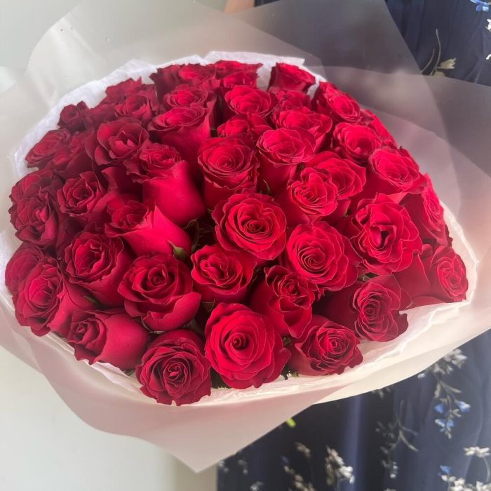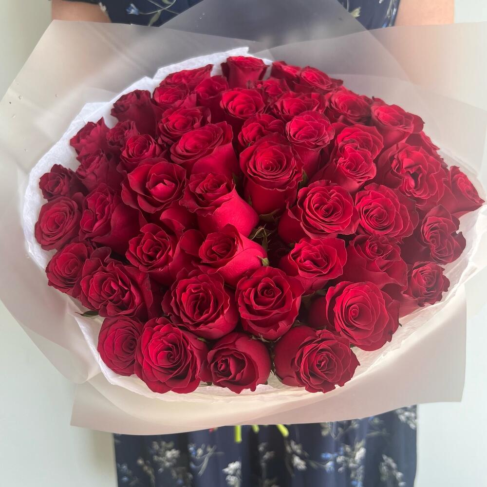 Лента атласная – 1 шт.Матовая пленка – 3 шт.Тишью белое – 2 шт.роза 40 см (кения) – 51 шт.