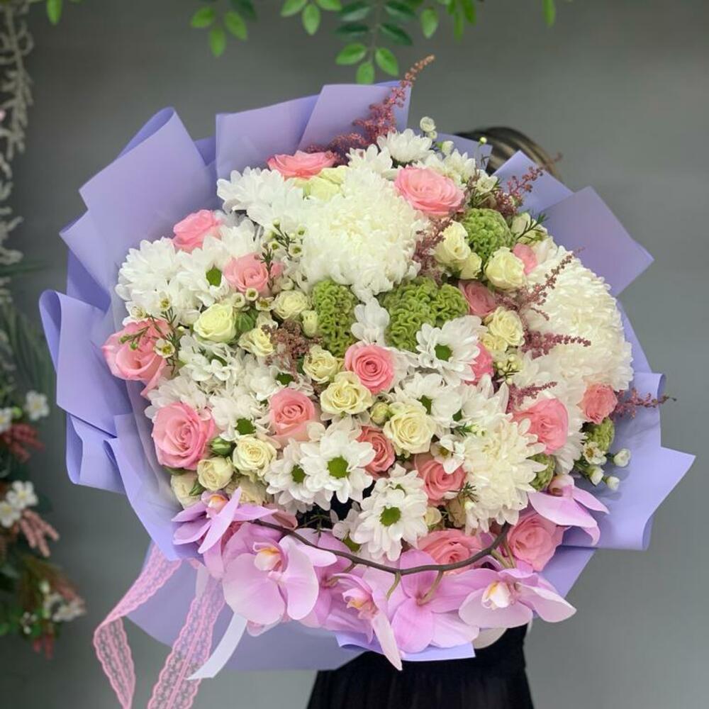 Альстромерии, Гвоздики, Кустовые розы, Лизиантусы, Розы, Хризантемы