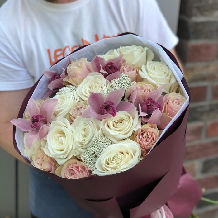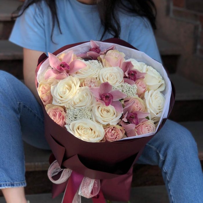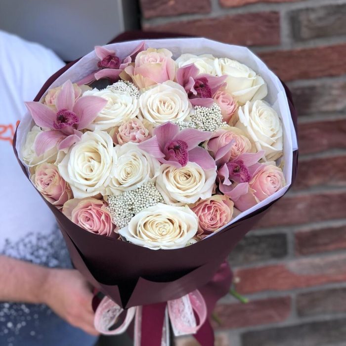 Озотамнус – 4 шт.Орхидея Цимбидиум – 5 шт.Писташ – 3 шт.Тишью – 2 шт.Пионовидная роза – 10 шт.Упаковка дизайнерская – 5 шт.Роза пинк мондиаль – 9 шт.лента премиум – 5 шт.