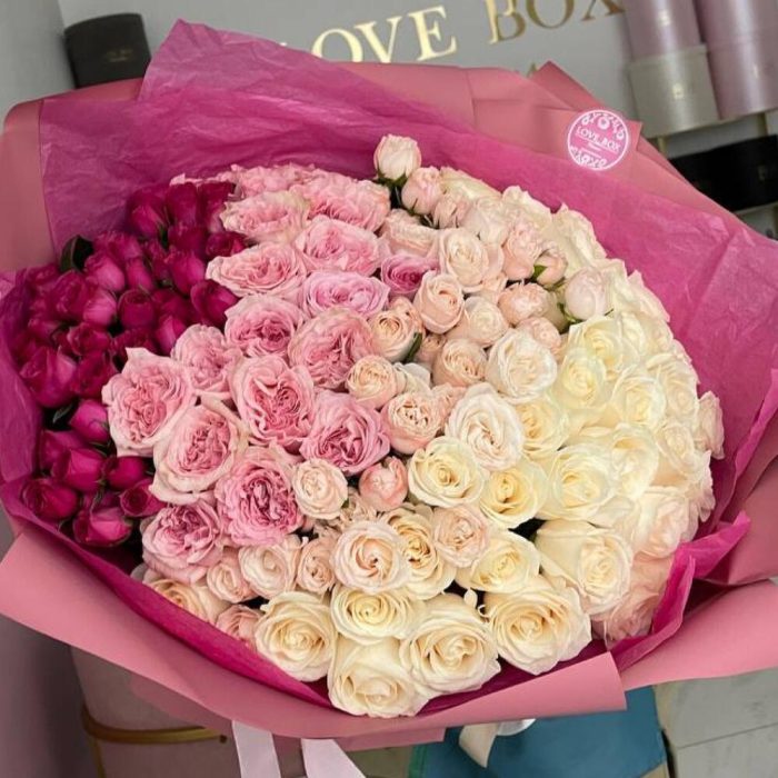 Роза Эквадор – 45 шт.Роза пионовидная – 19 шт.Кустовая роза – 29 шт.Авторская упаковка – 5 шт.