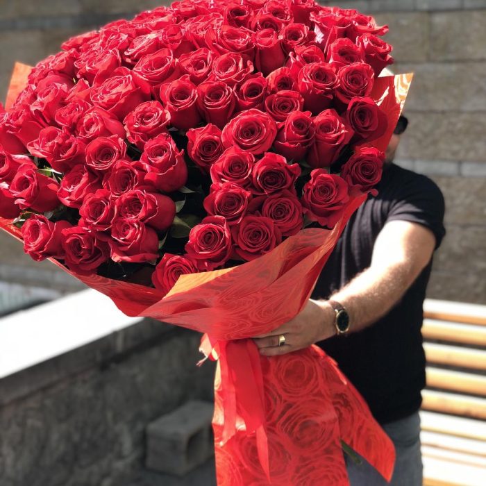 Большой, объемный букет из 101 метровой Розы, стильно упакованный в мешковину. Действительно, шикарный подарок для самой любимой!