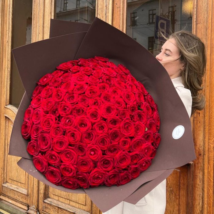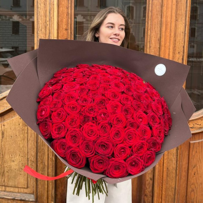 Роза красная 60 см – 101 шт.Дизайнерская упаковка – 3 шт.Лента атласная – 2 шт.