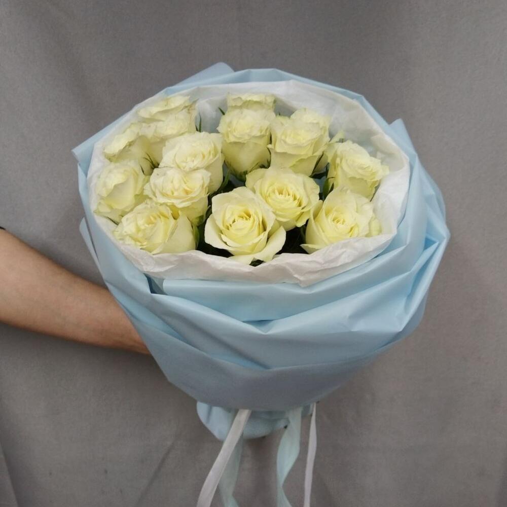 роза кения белая 40 см – 15 шт.Корейская пленка – 1 шт.Тишью белое – 1 шт.Атласная лента – 1 шт.