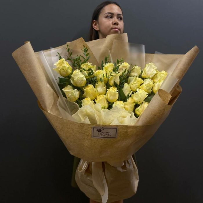 Букет из 25 белых роз и эвкалипта в крафтовой упаковке “Северный полюс”