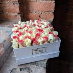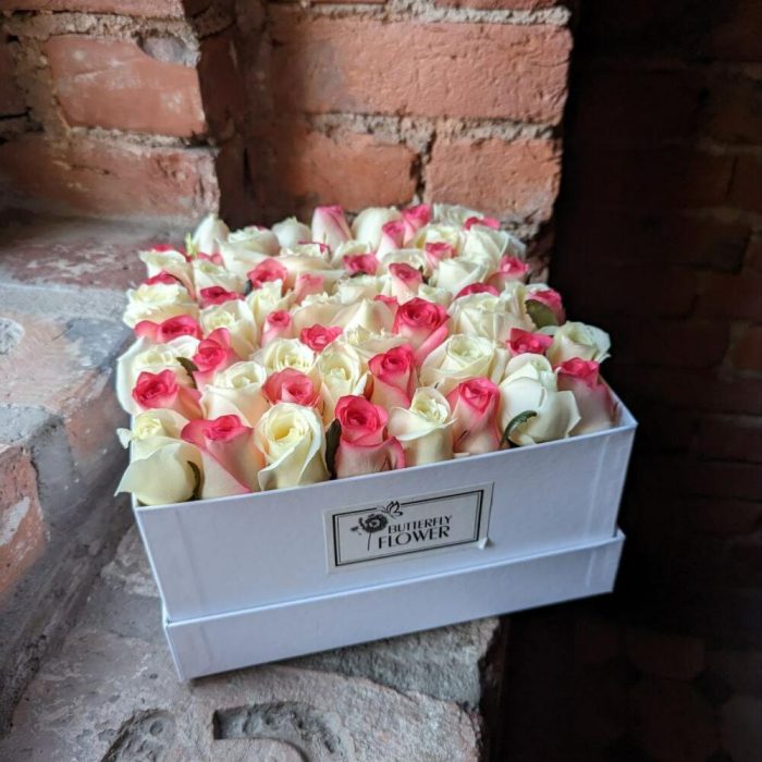 Букет из 65 розовых и белых роз в дизайнерской коробке “Ароматные шахматы”