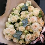 Букет из 9 кремовых кустовых пионовидных роз с эвкалиптом