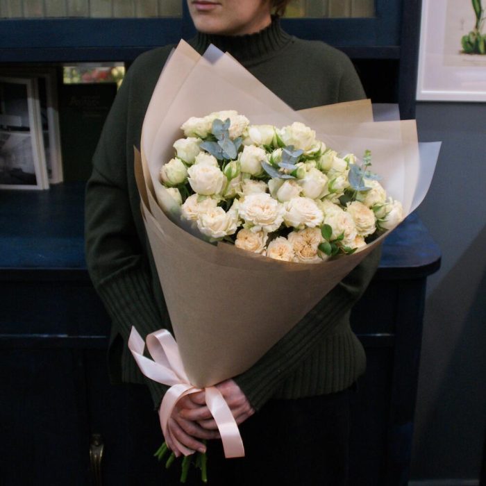 Букет из 9 кремовых кустовых пионовидных роз с эвкалиптом