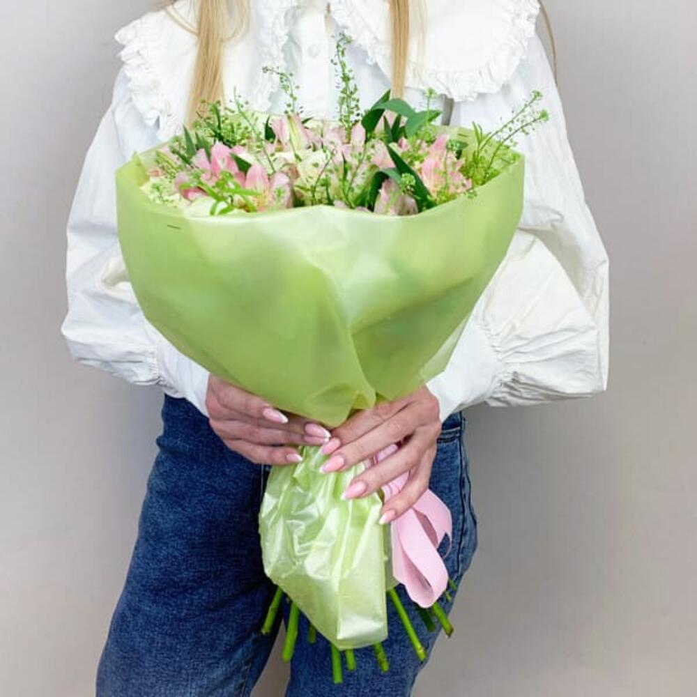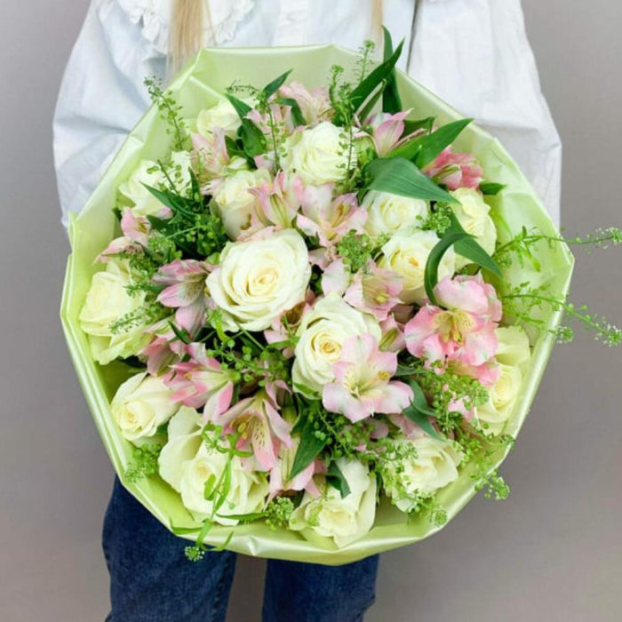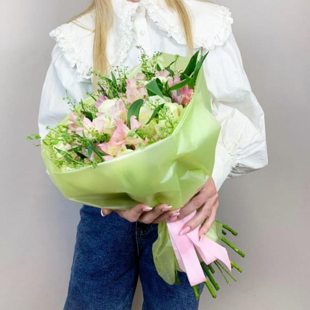 Упаковка – 1 шт.состав – белая роза 15 шт – 1 шт.альстромерия розовая – 7 шт + зелень – 1 шт.