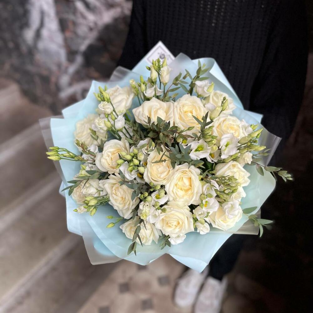 Букет из белых роз, эустомы и эвкалипта в стильной упаковке “Белый блюз”