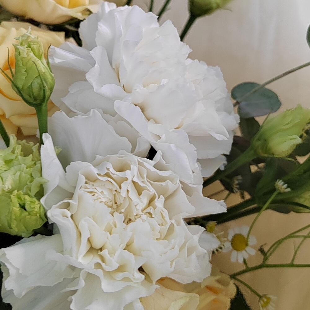 Букет из эустомы, кустовой розы и гвоздики