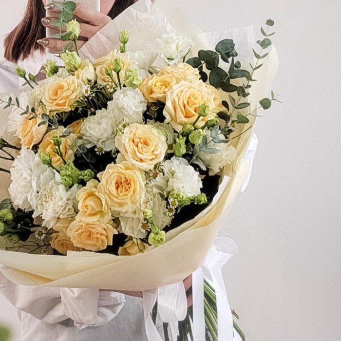 Роза кустовая – 4 шт.Гвоздика – 7 шт.Матрикария – 4 шт.Эустома – 4 шт.Эвкалипт – 3 шт.