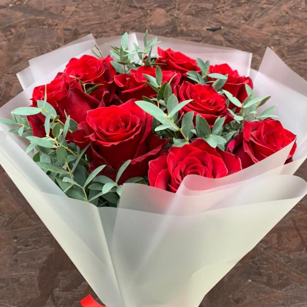 Роза красная – 9 шт.Эвкалипт – 3 шт.Упаковка дизайнерская – 2 шт.