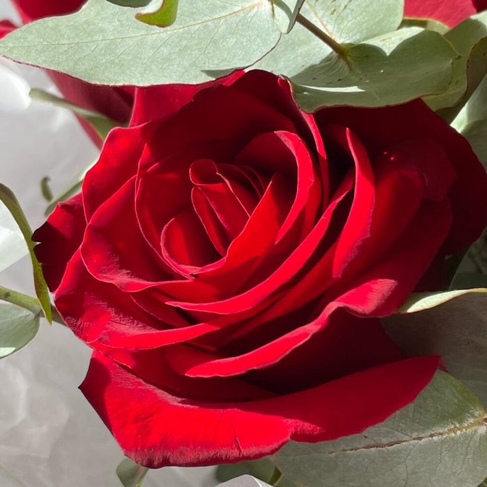 Эвкалипт – 2 шт.Роза одноголовая – 9 шт.Лента атласная – 1 шт.Упаковка дизайнерская – 1 шт.Тишью белое – 2 шт.