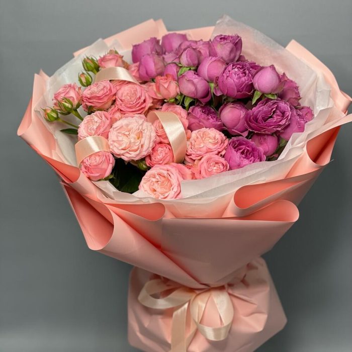 Лента – 2 шт.Роза кустовая пионовидная – 9 шт.Оформление матовая пленка – 7 шт.аквапак с водой – 1 шт.оформление тишью – 4 шт.