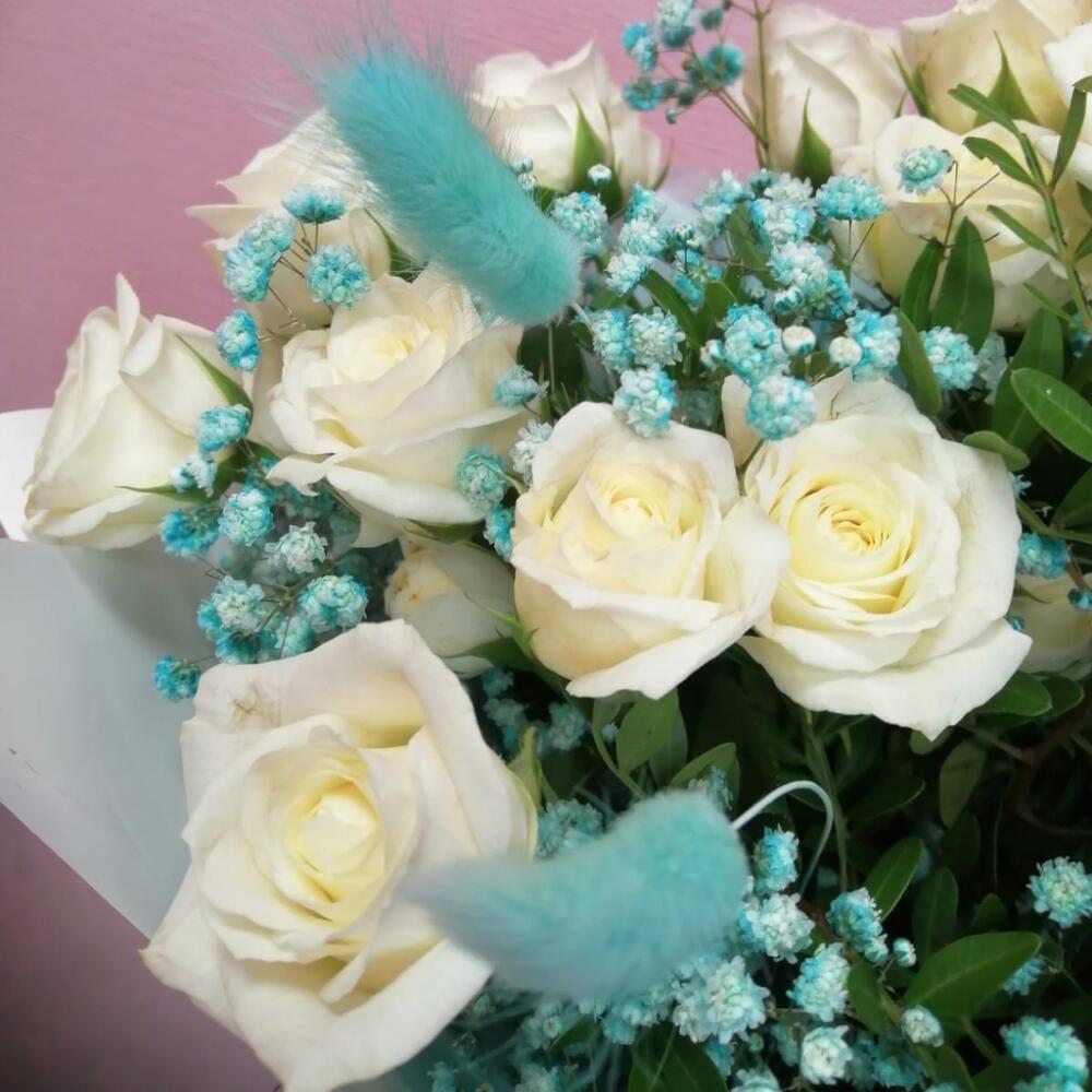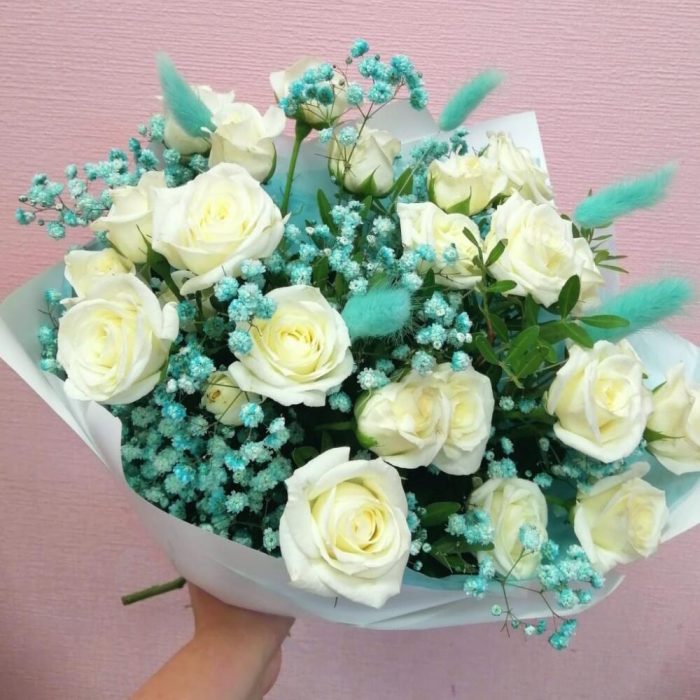 Роза кустовая – 5 шт.гипсофила радужная – 2 шт.Лагурус – 5 шт.зелень декоративная – 1 шт.