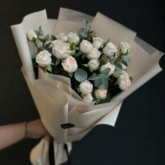 Кустовая пионовидная роза – 5 шт.Эвкалипт – 5 шт.декоративная упаковка – 1 шт.Атласная лента – 1 шт.