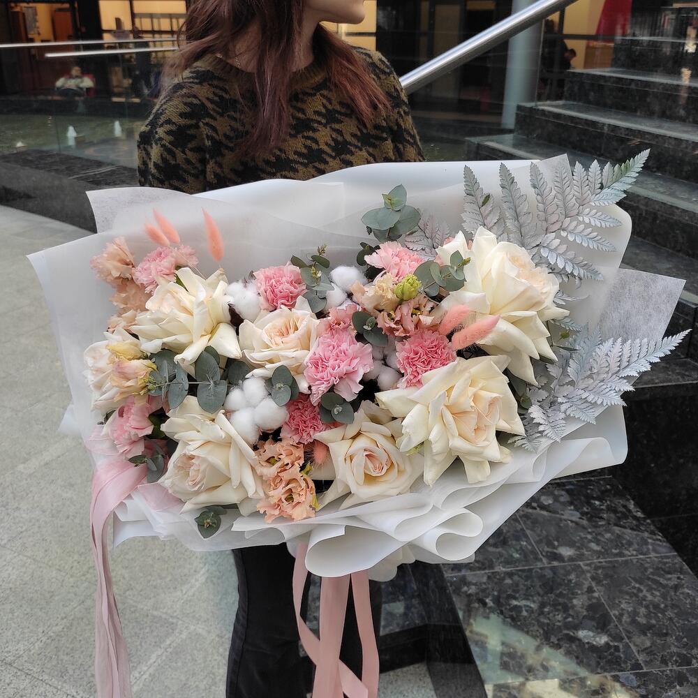 Категорий: Гвоздики, Лизиантусы, Пионовидные розы, Розы, Сухоцвет