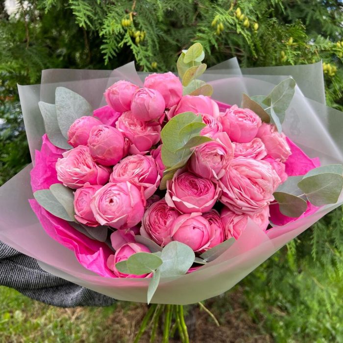 Роза пионовидная – 7 шт.эвкклипт – 3 шт.Тишью – 2 шт.Пленка матовая – 2 шт.