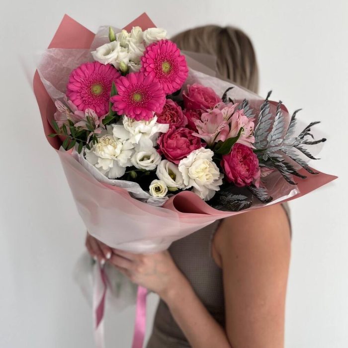 Альстромерия – 2 шт.Папоротник – 1 шт.Гербера – 3 шт.Диантус – 3 шт.Фисташка – 5 шт.Пионовидная кустовая роза – 2 шт.эустома белая – 2 шт.Дизайнерская упаковка – 3 шт.