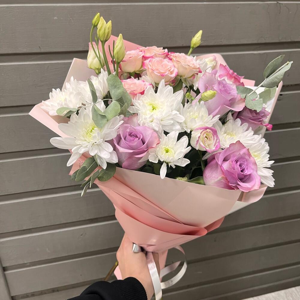 Роза – 5 шт.Хризантема кустовая – 4 шт.Роза кустовая – 1 шт.Эустома – 2 шт.Эвкалипт – 2 шт.Оформление – 1 шт.