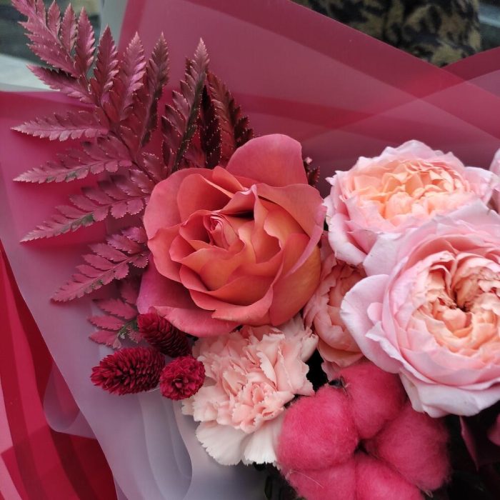 Роза кустовая пионовидная – 1 шт.Роза – 1 шт.леукондендрон – 2 шт.Хлопок – 2 шт.Гвоздика – 1 шт.Фаларис – 3 шт.Папоротник – 1 шт.Лента – 2 шт.Упаковка дизайнерская – 2 шт.