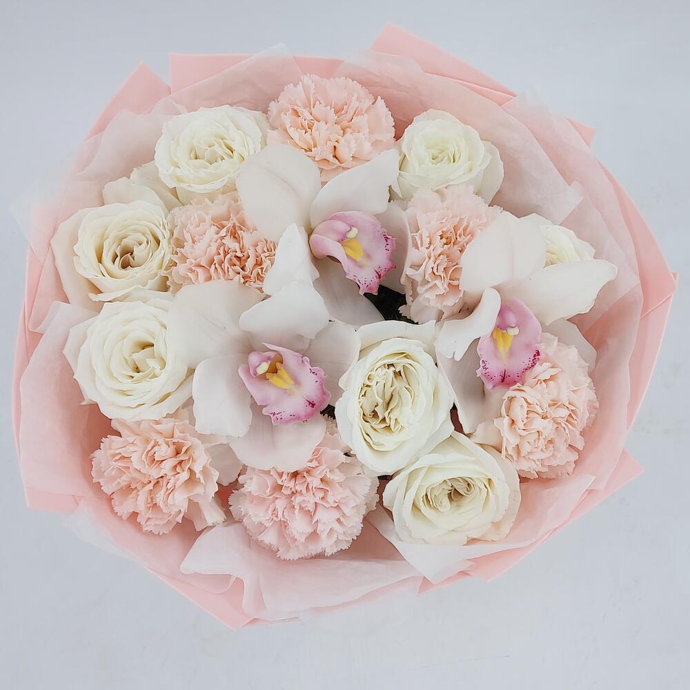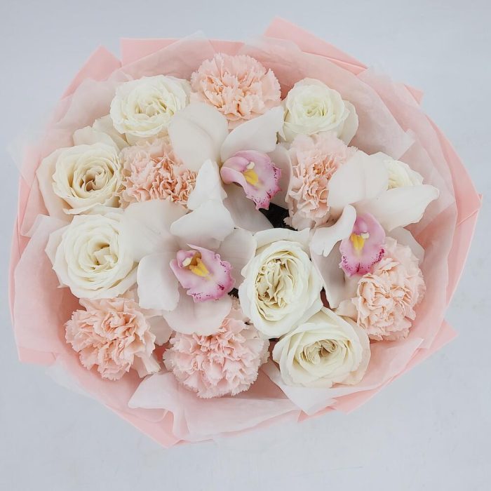 Роза Эквадор – 7 шт.Упаковка дизайнерская – 1 шт.Пистация – 5 шт.Орхидея цимбидиум бутон – 3 шт.гвоздика сортовая (диантус) – 6 шт.