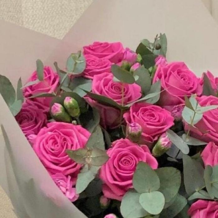 Роза розовая – 19 шт.Эвкалипт – 10 шт.Упаковка дизайнерская – 1 шт.Лента атласная – 2 шт.Открыточка с вашими пожеланиями – 1 шт.хорошее настроение – 100 шт.инструкция по уходу за цветами – 1 шт.коробка переноска – 1 шт.Кризал – 1 шт.