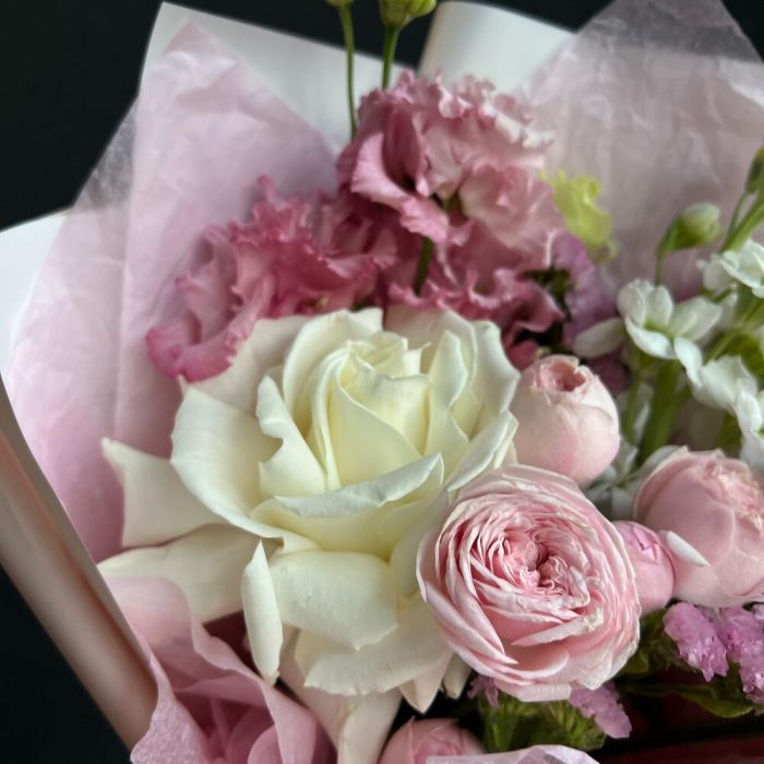 Маттиола – 1 шт.Статица – 1 шт.Атласная лента – 1 шт.Кустовая пионовидная роза – 1 шт.Одноголовая роза – 1 шт.декоративная упаковка – 1 шт.