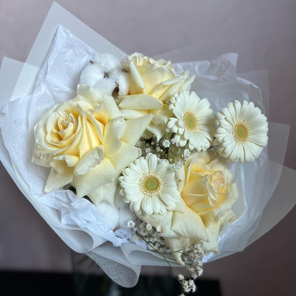 Одноголовая роза – 3 шт.Гербера – 3 шт.Гипсофила – 1 шт.Сухоцвет – 2 шт.декоративная упаковка – 1 шт.Атласная лента – 1 шт.