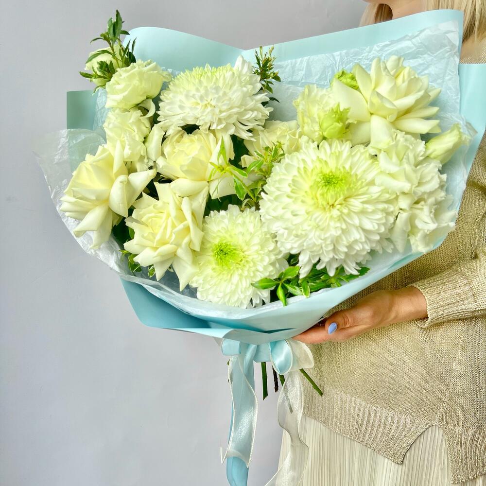 Букет «Облачный» с крупной хризантемой, розами и лизиантусом