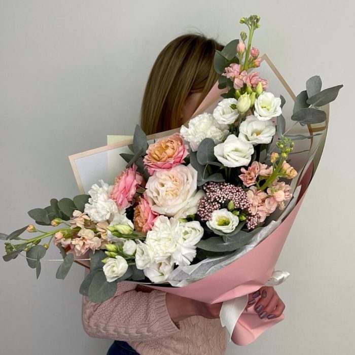Роза Эквадор – 1 шт.Роза пионовидная кустовая – 1 шт.Диантус – 3 шт.Лизиантус – 2 шт.Озотамнус – 1 шт.Маттиола – 3 шт.Эвкалипт – 2 шт.Фисташка – 3 шт.Упаковка дизайнерская – 3 шт.