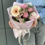 Альстромерия – 1 шт. Писташ – 2 шт. Оформление – 1 шт. герберы – 1 шт. кустовая роза артезия – 1 шт.