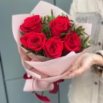 роза красная фридом – 5 шт. Писташ – 4 шт. Оформление – 1 шт.