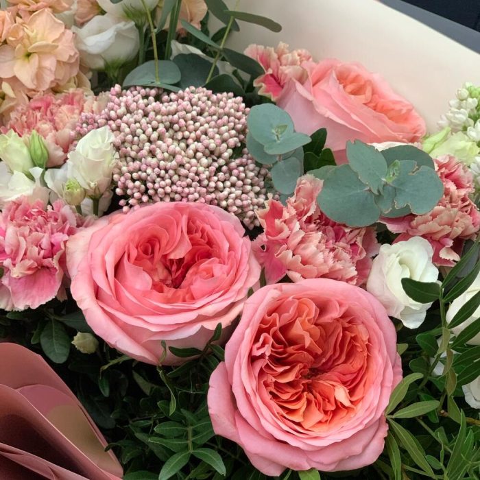 Букет с ароматными розами и эвкалиптом