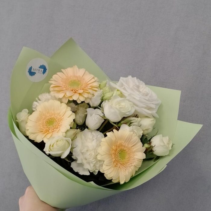 Гербера – 3 шт.роза плая бланка – 1 шт.куст роза – 2 шт.Диантус – 2 шт.Лизиантус – 1 шт.