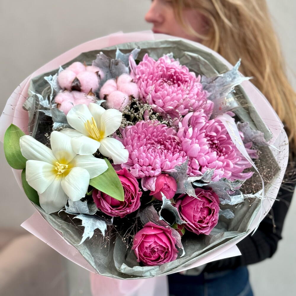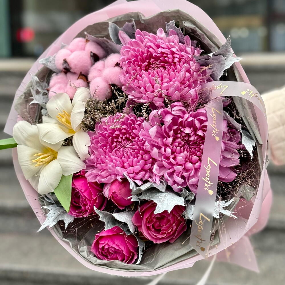Альстромерии, Гвоздики, Кустовые розы, Лизиантусы, Розы, Хризантемы