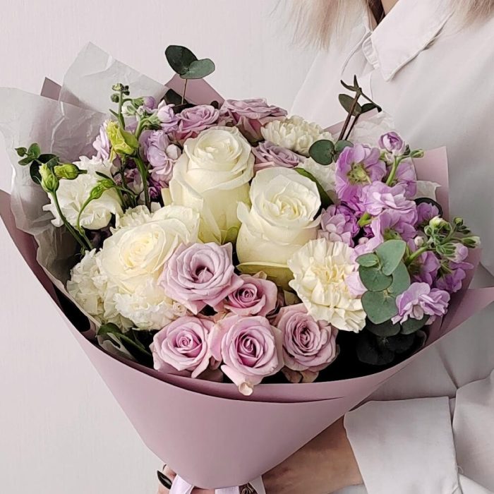 Маттиола – 2 шт.Эвкалипт – 3 шт.Роза одноголовая – 3 шт.Гвоздика – 3 шт.Эустома – 2 шт.Лента атласная – 4 шт.Упаковка дизайнерская – 4 шт.Салал пучок – 5 шт.роза кустовая лавандовая – 2 шт.
