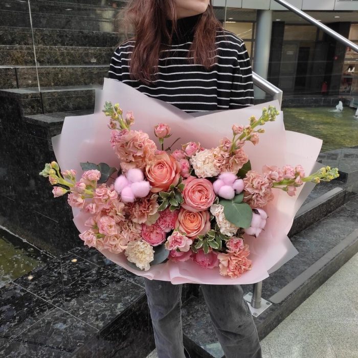 Маттиола – 5 шт.Роза – 3 шт.Роза кустовая – 1 шт.Роза кустовая пионовидная – 1 шт.Диантус – 6 шт.Эвкалипт – 1 шт.Питтоспорум – 1 шт.Хлопок – 3 шт.Упаковка дизайнерская – 2 шт.Лента атласная – 2 шт.