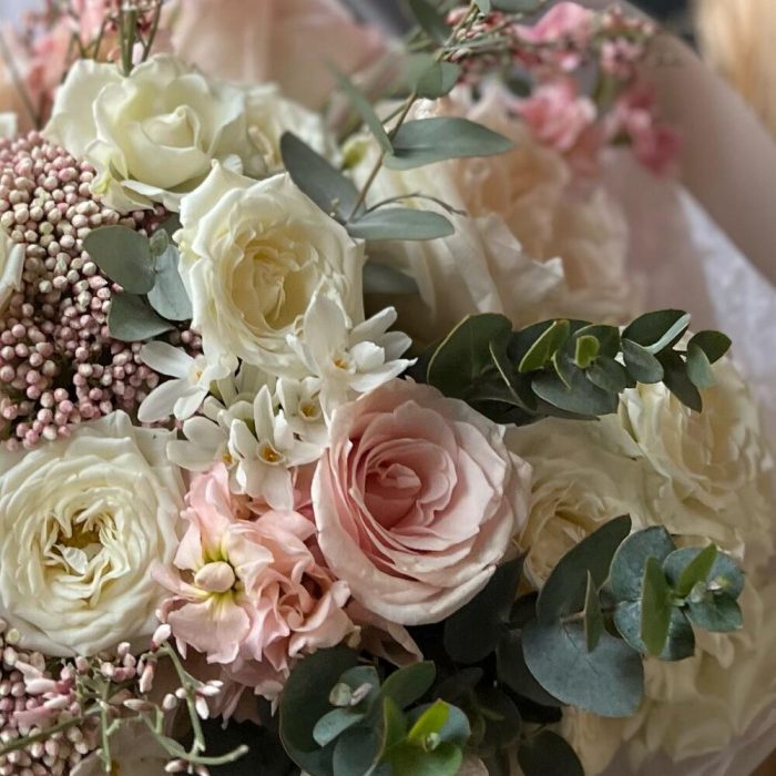 Пионовидная роза – 7 шт.Кустовая роза – 5 шт.Одноголовая роза – 3 шт.Гениста – 2 шт.Озотамнус – 2 шт.Маттиола – 3 шт.нарциссов – 5 шт.Эвкалипт – 5 шт.декоративная упаковка – 1 шт.Атласная лента – 1 шт.
