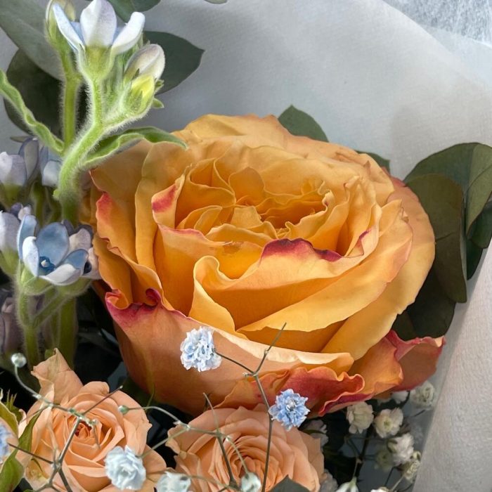 Гипсофила – 1 шт.Лента – 1 шт.Роза кустовая – 2 шт.Эвкалипт – 1 шт.Роза одноголовая – 3 шт.Оксипеталум – 2 шт.Упаковка дизайнерская – 1 шт.