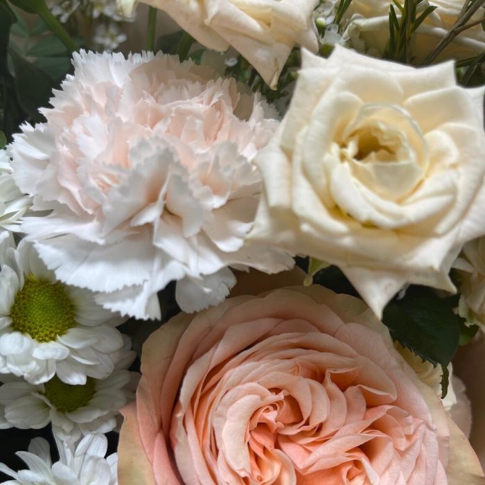 Маттиола – 2 шт.Гвоздика – 2 шт.Лента атласная – 1 шт.Сантини – 2 шт.Фисташка – 2 шт.Упаковка дизайнерская – 1 шт.Ваксфлауэр белый – 2 шт.кахала роза – 2 шт.таня кустовая роза – 4 шт.