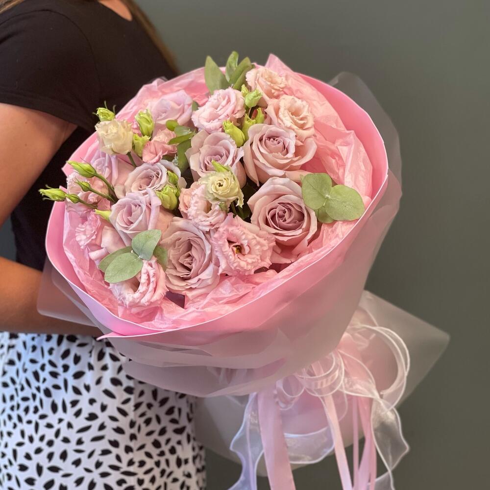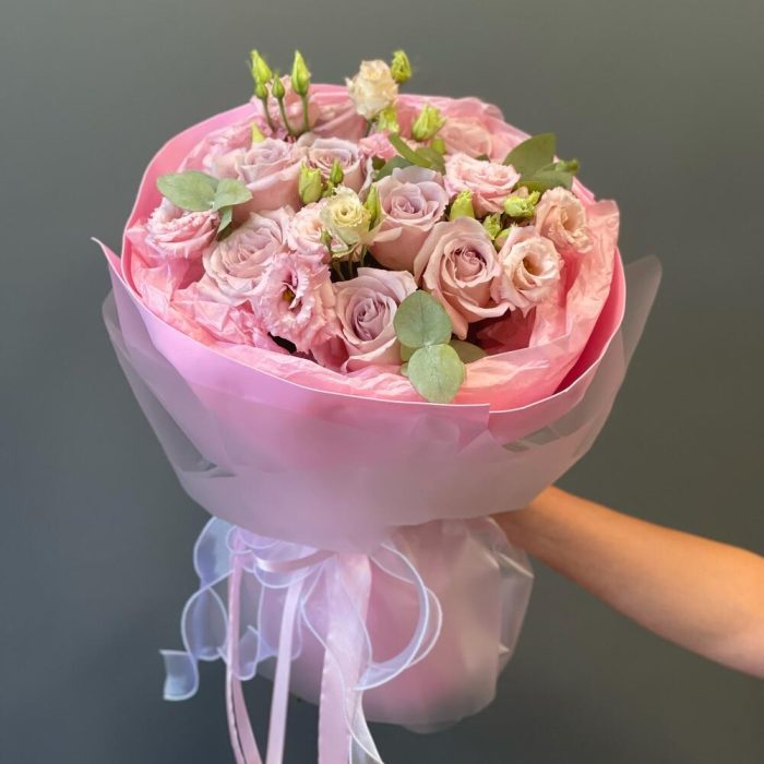 Букет с розами и лизиантусом “Клубника с шампанским”