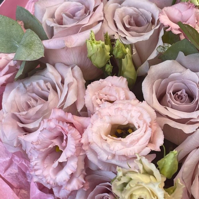 Лента – 3 шт.Лизиантус – 3 шт.Эвкалипт – 2 шт.Роза одноголовая – 9 шт.Упаковка – 1 шт.