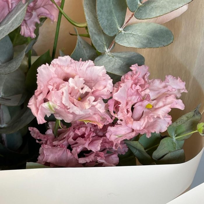 Лента – 2 шт.Лизиантус – 3 шт.Эвкалипт – 2 шт.Роза одноголовая – 5 шт.Упаковка дизайнерская – 2 шт.