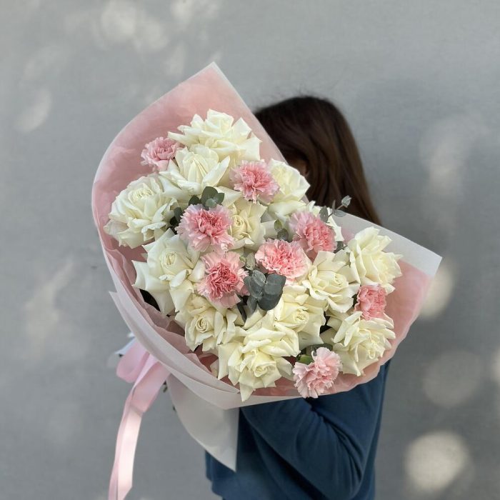 Изящный букет из кремовых роз и розовых гвоздик.