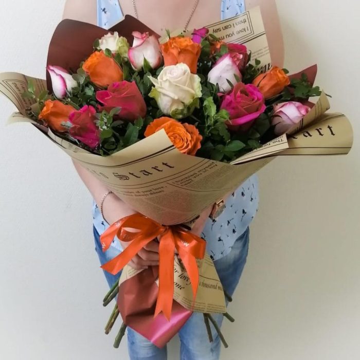 Упаковка дизайнерская – 1 шт.зелень декоративная – 6 шт.роза микс – 15 шт.